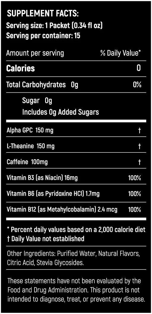 Zero Sugar. 150mg Alpha-GPC. 150mg L-Theanine. 100mg Caffeine. Essential B-Vitamins. Tastes Great.
